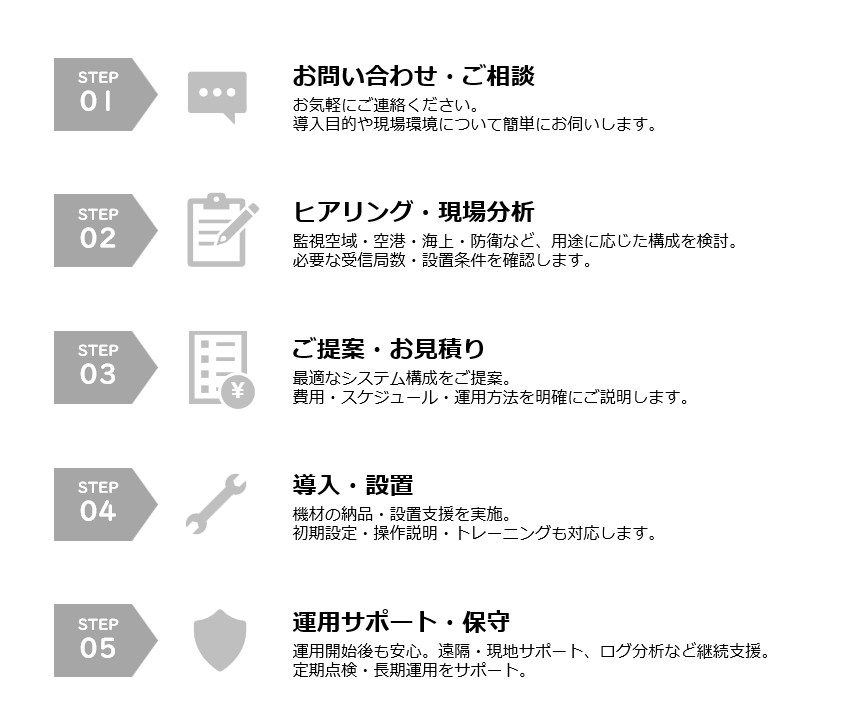 中央処理ユニットでは、AIによる信号解析・ノイズ除去・誤検知抑制を行い、リアルタイムで航空機の位置情報を生成。ASTERIXやSNMPなどの標準インターフェースを通じて、外部システムとの連携も容易です。システムは空港周辺、海上、防空領域など、用途に応じて柔軟に構成可能です。