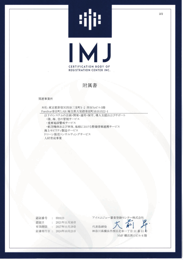 | 登録範囲 | 以下、システムの企画・開発・運用・保守、導入支援およびサポート ・陸・海・空の管制サービス ・重要施設警戒サービス ・航空機体および車体、船舶における整備情報連携サービス 海上モビリティ製造サービス ドローン販売コンサルティングサービス 人材育成事業 |
